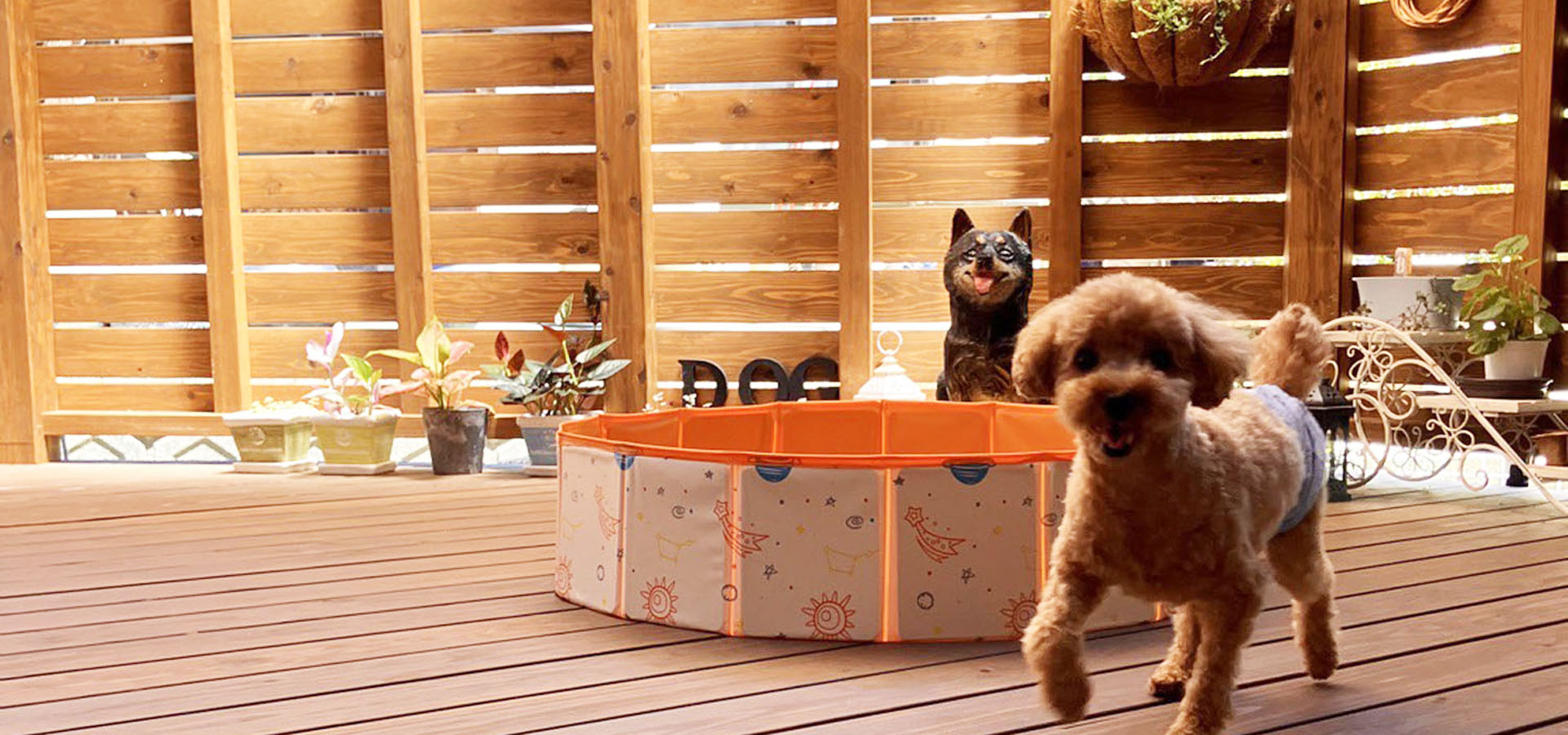 ②【デイサービス】・・①と同じ理由で介護が必要な場合。わんちゃんを施設にて数時間お預かりしお世話をさせていただきます。こちらのサービスのメリットは、お天気がいい日は外に出てドッグランやウッドデッキ(屋根付)で自由にのんびり過ごすことができます。