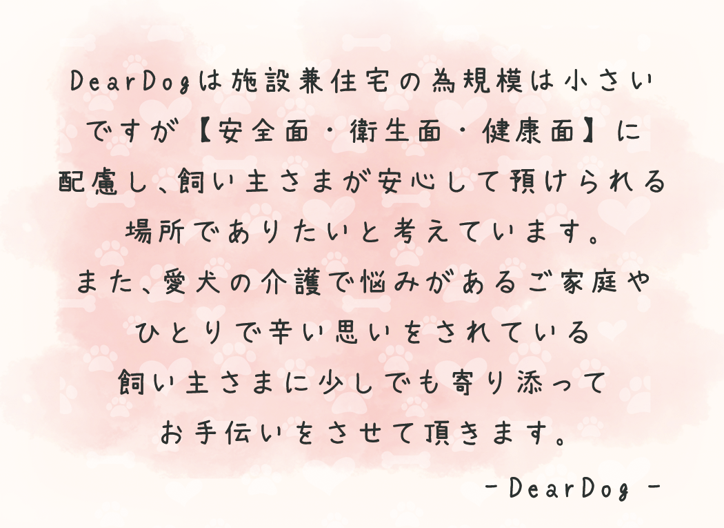 施設が小規模の為、小型犬、中型犬のお預かりに限らせて頂きます。(DearDog基準をご覧下さい)お預かりできる頭数は1日最大5頭までとなります。(保健所の規定に沿って行う為。)